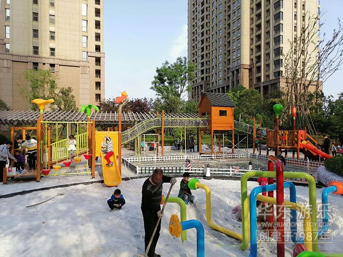 • 该项目采用非标定制木制工艺,有滑梯、沙池、传声筒 、爬网已经音乐系列的敲打设备,整体设计完美,符合房地产整体规划。