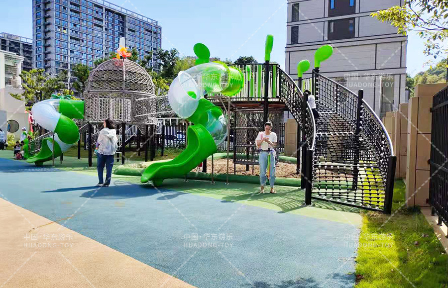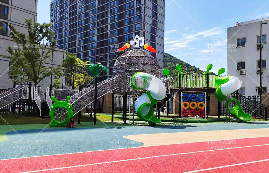 舟山市畚斗岙幼儿园此次选用的是又leyu乐鱼游乐自主研发和设计的网绳系列户外滑梯组合,具备了爬网、钻洞、滑梯、滑桶、吊环、攀爬梯、沙池等游乐设备,能够让小朋友在玩耍中得到很好的锻炼和学习。