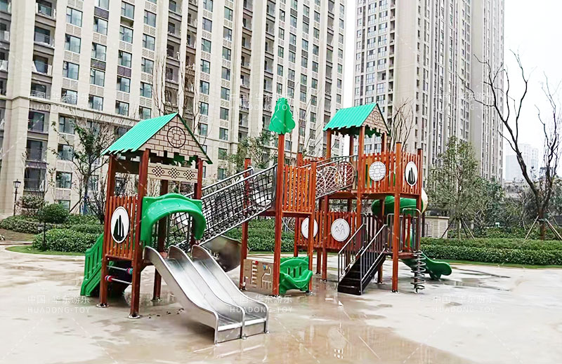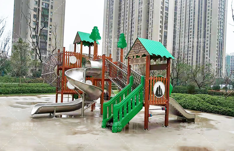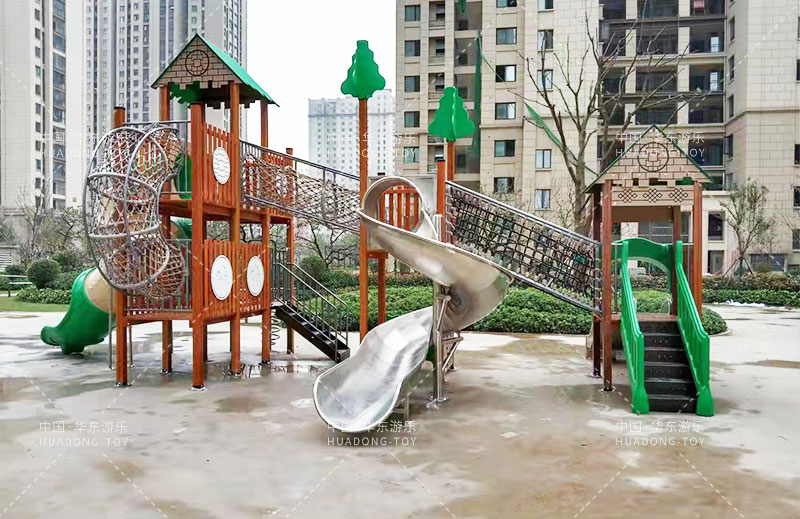 荣盛华府选用的是leyu乐鱼游乐自主设计的具有攀爬网、U型爬网、不锈钢滑梯、网桥、滑桶为一体的综合性游乐设备。