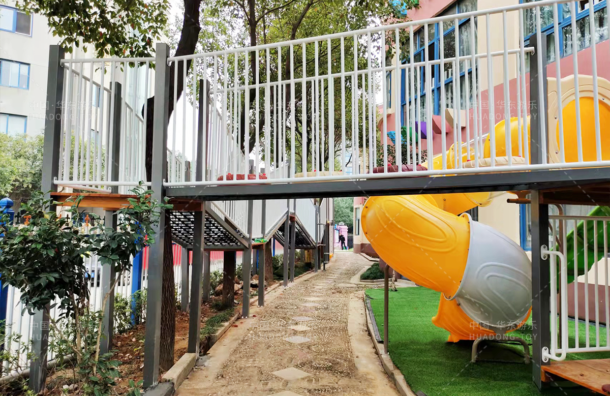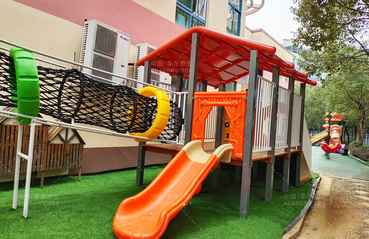 绿都幼儿园选用的是leyu乐鱼游乐自主研发的具有攀爬、滑梯、爬网、钻洞、葫芦攀爬为一体的综合性游乐设备。