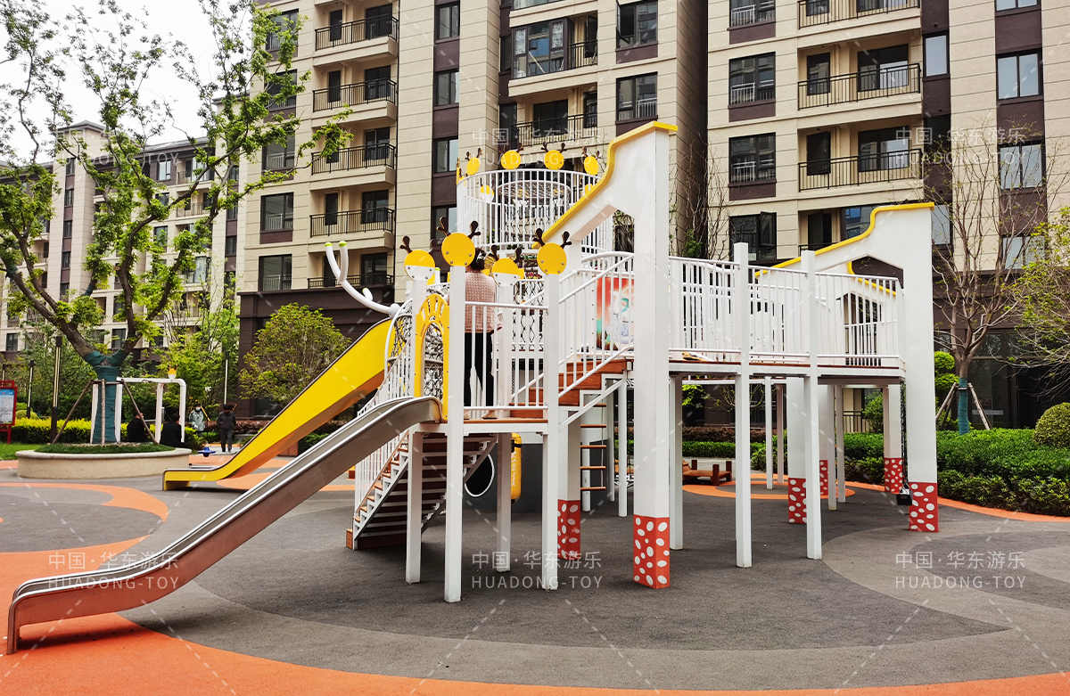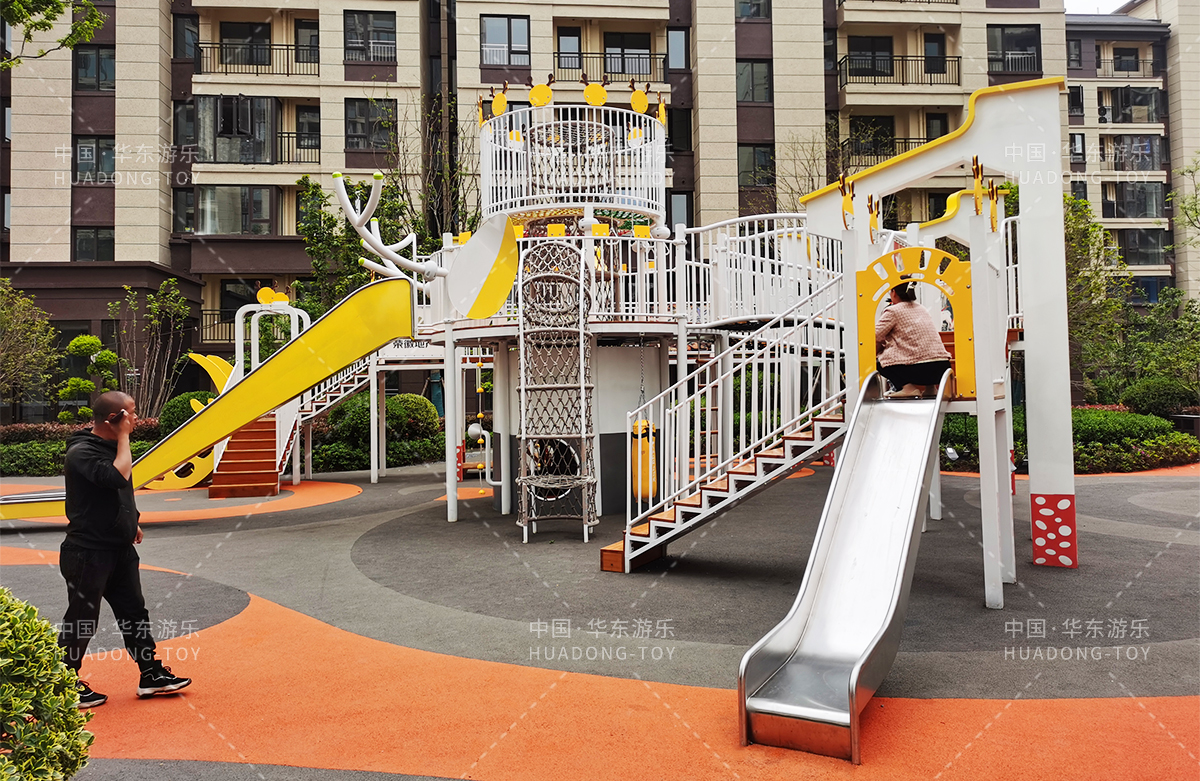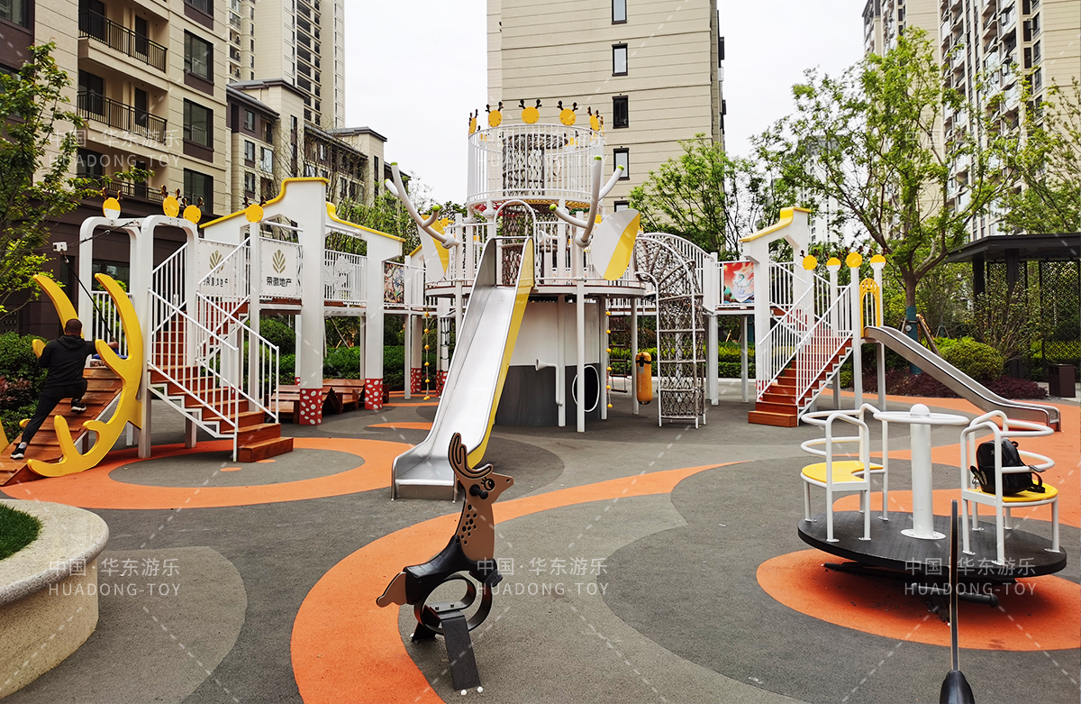 东方名府云著此次选用的是leyu乐鱼游乐自主研发和生产的无动力游乐设备,采用的是以麋鹿为主题的综合性游乐园,整个游乐园分别设计了小朋友喜欢的儿童跷跷板、打击乐器、儿童摇摇乐,以及和具备不锈钢滑梯、攀爬网、攀爬绳、攀爬梯等功能的麋鹿组合滑梯等游乐设备。