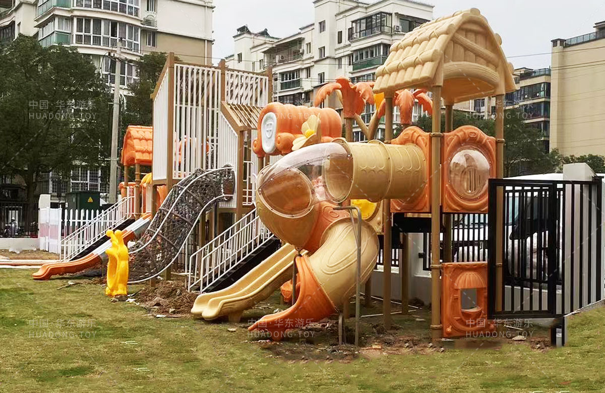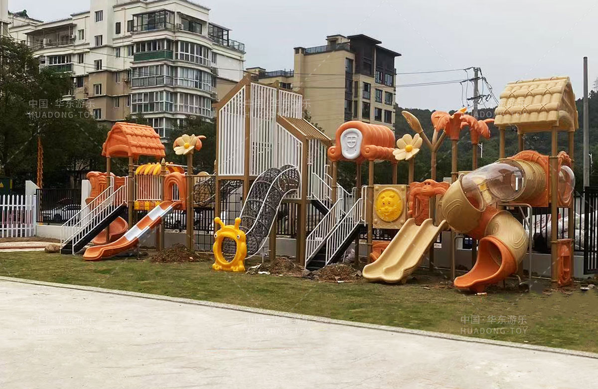永嘉县童真幼儿园是一家专业的学前培训学校,此次选用的儿童游乐设备是leyu乐鱼游乐自主研发和设计的大型户外组合滑梯,该滑梯是一款具备了攀爬网、大型滑筒、旋转滑梯、直行走梯、双人滑梯等功能为一体的综合性游乐设备。
