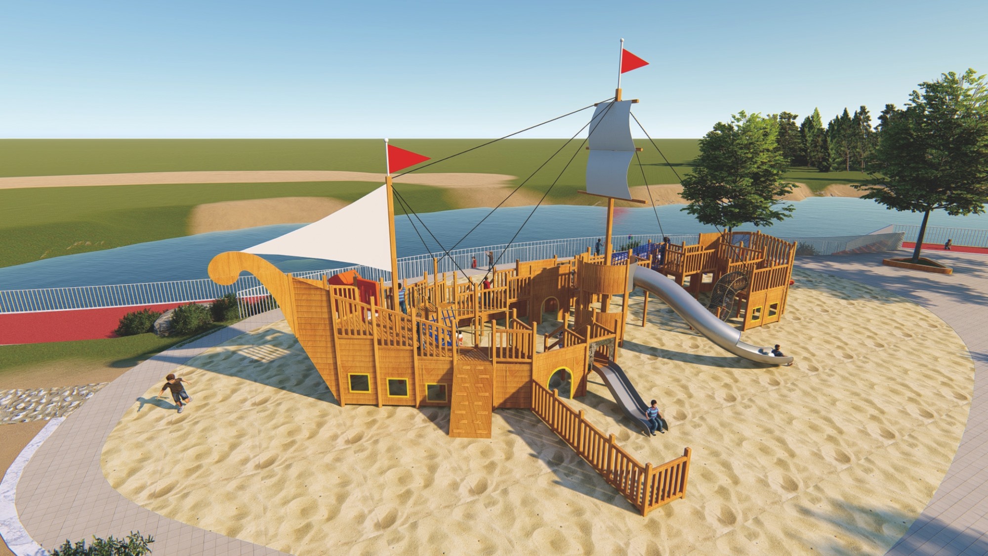 木质海盗船组合滑梯的设计以大自然为主题,融合了船体、桅杆、甲板等元素,外观新颖、结构牢固。它集攀爬、滑梯、秋千等功能于一体,旨在锻炼孩子的平衡协调能力和自我保护意识,同时培养探险精神。