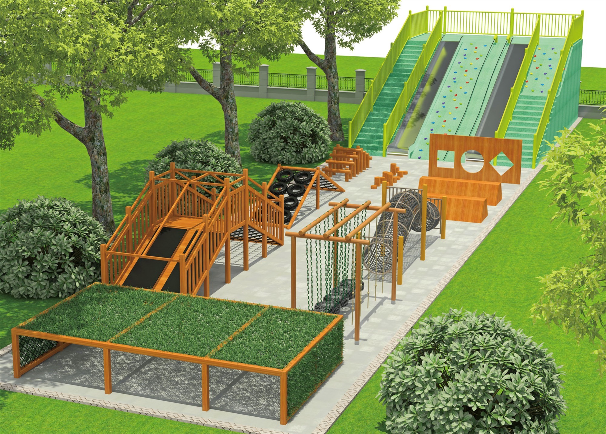 木质拓展设施采用天然木材打造,设计注重安全与挑战并重。通过悬挂桥、攀爬网、平衡木等多样化的障碍元素,旨在提升参与者的体能、平衡感及团队协作能力,同时享受亲近自然、挑战自我的乐趣。